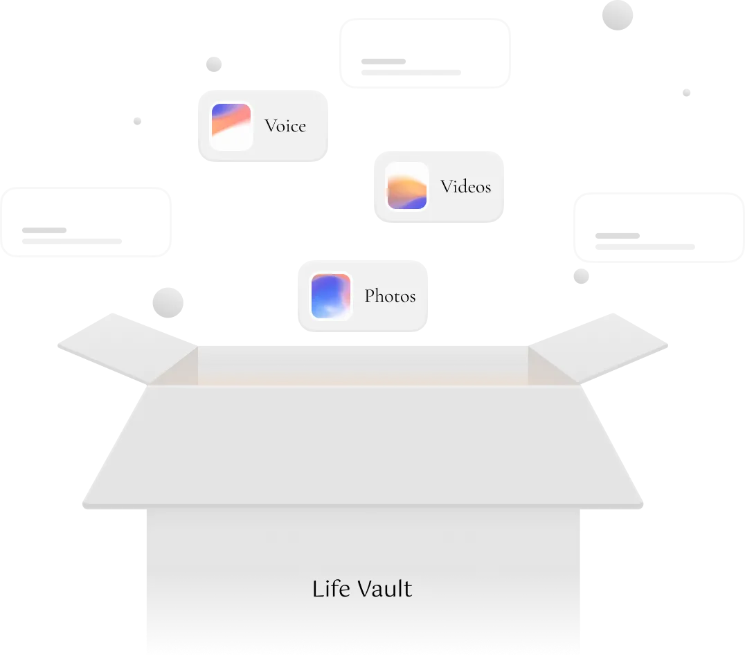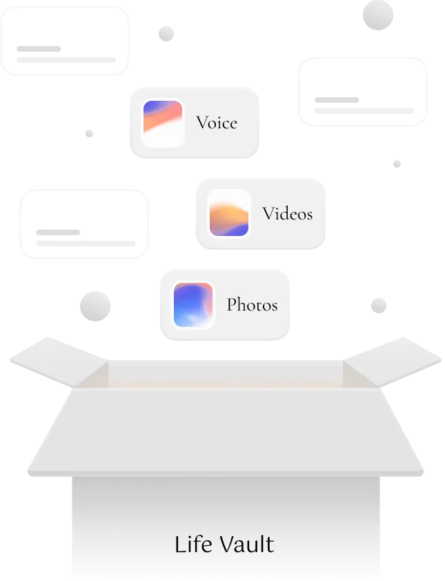 Warm, guided conversations with your loved ones, we handle all the asking and listening. Every story, voice, and photo is carefully gathered and curated into your private LifeVault™, the home of your family’s memories